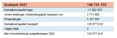 Sektoren si ramme er auka frå 2021, dette gir ei meir realistisk ramme. I dette ligg det mellom anna at omgjering av tiltak frå i fjor med nedlegging og omgjering av institusjonsplassar er reversert med 3 millionar. Vidare er er ansvaret for brukarstyrt personleg assistanse (BPA) styrka med 2 millionar og refusjon ressurskrevjande bruakar er teke ned med om lag 5 millionar. Utgifter frå vikar er redusert og nokre av midlane der er brukt til å opprette to nye faste stillingar i ressurslag.