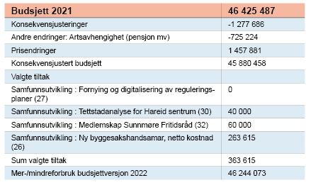For 2022 har ein fått overført fleire ansvar frå Sektor for Læring og Kultur på om lag kr 3,2 mill. I tillegg til dette har ein teke over Folkehelsekoordinator frå Sentral- administrasjonen og det er etablert ei ny eining – Næring Kultur og Busetting som har fått ei ny stilling. For å få dette til har ein konsekvensjustert ramma ned med over 2 mill. Samstundes har ein konsekvensjustert inn midlar til mellom anna fiberutbygginga til Alme.